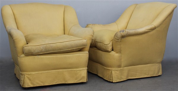 Coppia di poltrone imbottite e rivestite in tessuto giallo, piedini in legno massello troncoconici. Italia, anni '50. (cm 82x80x80) (difetti al rivestimento)