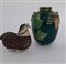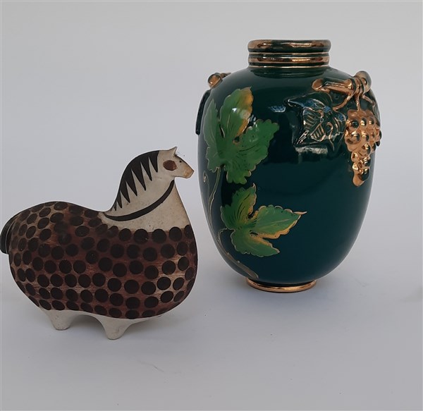 Vaso in ceramica smaltata verde con decori a rilievo raffiguranti uva unito a un cavallino in terracotta policroma. Secolo XX. (misure diverse)