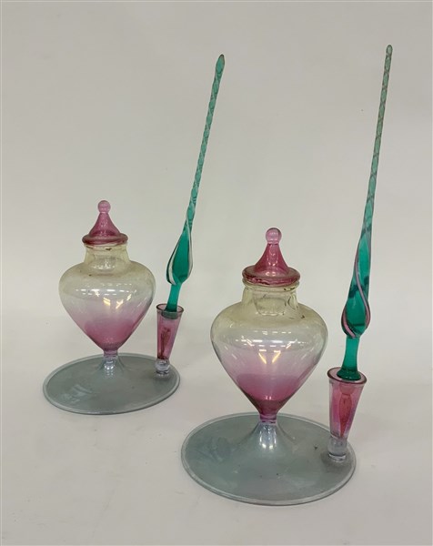 Due calamai in vetro soffiato soffiato trasparente ametista e verdino, pennini in vetro soffiato trasparente verdino con filamenti in vetro lattimo e rosa. Italia, seconda metà secolo XX. (h max cm 21)