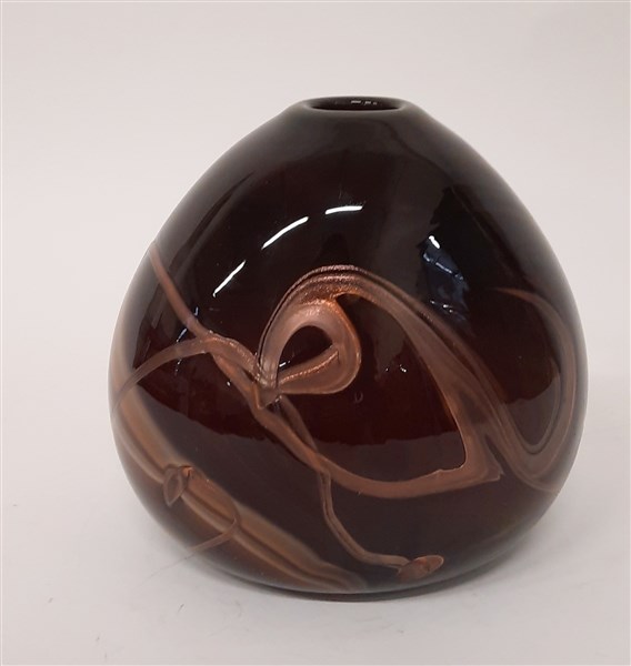 Vaso ovoidale in vetro massello con decori incisi alla mola dorati. Italia. Recante marchio della manifattura sotto la base. (h cm 16)