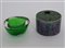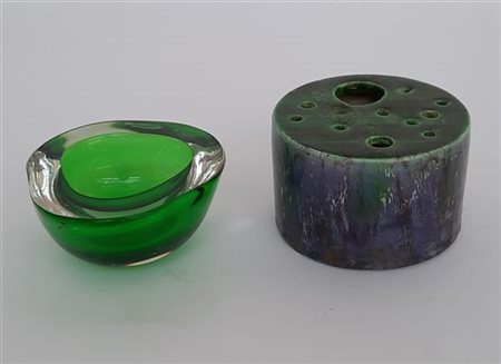 Portacenere in vetro massello verde unita a un piccolo centrotavola in ceramica smaltata nei toni del blu e del verde. Italia, secolo XX. (misure diverse) (difetti)