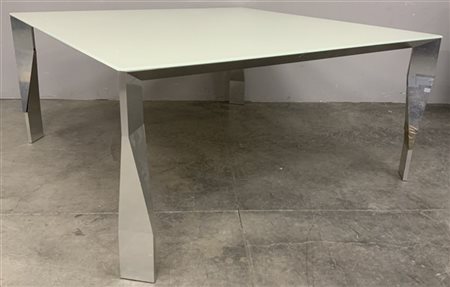 Tavolo con piano in vetro temperato retroverniciato créme, gambe impiallacciate in alluminio. Italia, anni '90. (cm 160x74x160) (difetti)