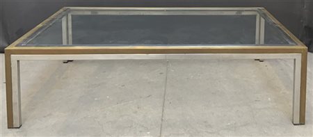 Tavolino da salotto con struttura in acciaio Aisi e ottone, piano in cristallo.