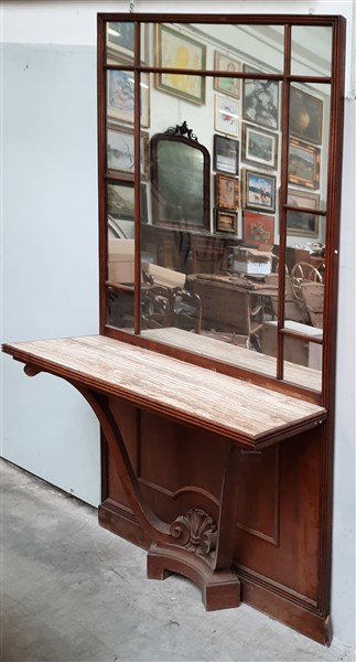 Specchiera con consolle in legno massello, piano in travertino. Italia, anni '40. (cm 120x32x44) (difetti)