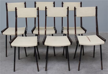 Lotto di sei sedie con struttura in acciaio verniciato nero, ottone e legno, minuteria in ottone, seduta e schienale rivestiti in vinilpelle beige. Italia, anni '50. (cm 43,5x91,5x51) (difetti)
