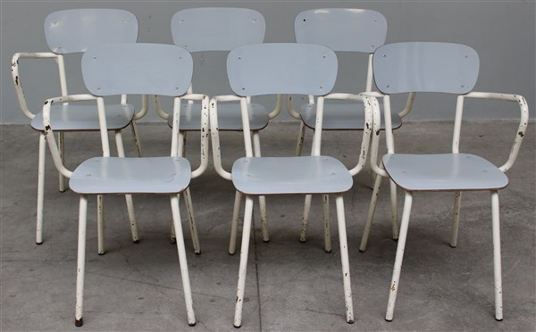Lotto di sei poltroncine in acciaio verniciato bianco, seduta e schienale in compensato rivestito in formica azzurra. Italia, anni '50. (cm 48,5x77x50) (difetti)