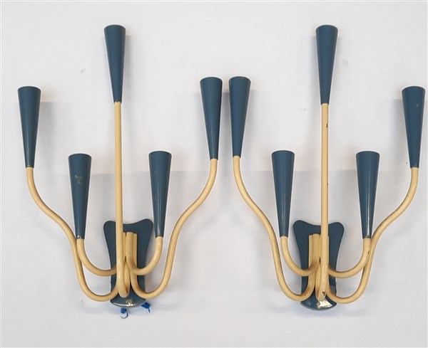 Coppia di lampade da parete a cinque luci con struttura in metallo verniciato ocra e portalampadina in metallo verniciato azzurro. Italia, anni '60. (h cm 34,5) (lievi difetti)