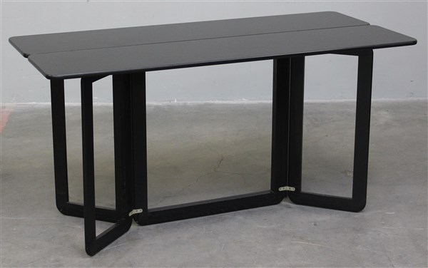 Tavolo-consolle modello "Libro". Produzione MC Selvini, Italia, anni '70. Legno laccato nero. (consolle aperta cm 64x9,5x138; consolle chiusa cm 32x) (lievi difetti)