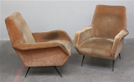 Coppia di poltrone imbottite e rivestite in velluto marrone chiaro, gambe in metallo verniciato nero, piedini in ottone. Italia, anni '50. (cm 76x88x80) (lievi difetti)