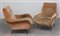 Coppia di poltrone imbottite e rivestite in velluto marrone chiaro, gambe in me