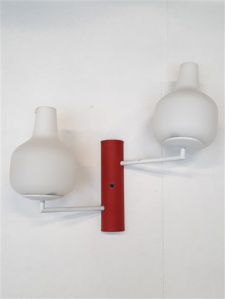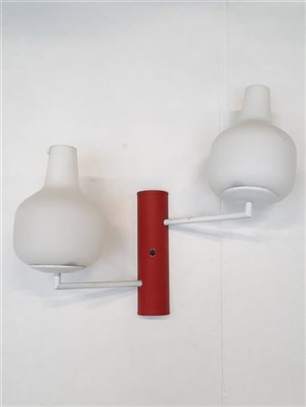Lampada da parete a due luci, con struttura in metallo verniciato bianco e rosso, paralumi in vetro lattimo. Italia, anni '60. (h cm 38) (lievi difetti)