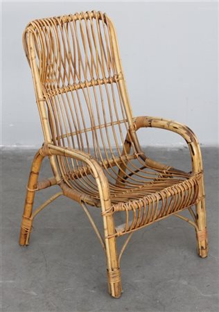 Poltroncina con struttura in manao, malacca e scortecciato. Italia, anni '70. (