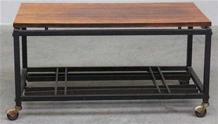 Carrello basso con struttura in metallo verniciato nero, piano in legno impiallacciato. Italia, anni '60. (cm 74x39x37) (lievi difetti)
