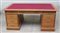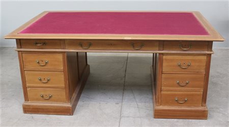 Scrivania da centro in legno con cassetti e ante laterali, piano in legno rivestito in velluto rosso, tre cassetti sottopiano. Italia, anni '40/'50. (cm 180x76x109) (difetti)