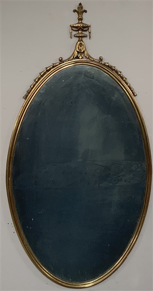 Specchio con cornice in ottone, cimasa di gusto barocco. Italia, anni '50. (cm 48x94) (lievi difetti)