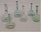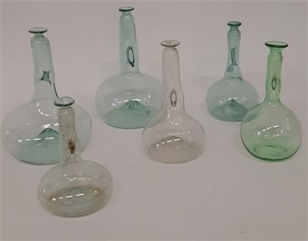 Lotto composto da sei vasi a collo stretto in vetro soffiato trasparente incolore, verdino e iridato. Italia, seconda metà secolo XX. (h max cm 25) (lievi difetti)