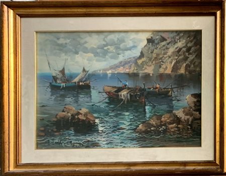 Firma indecifrata "Marina con pescatori" olio su tela (cm 50x70) Firmato in basso a sinistra. In cornice