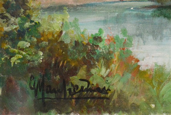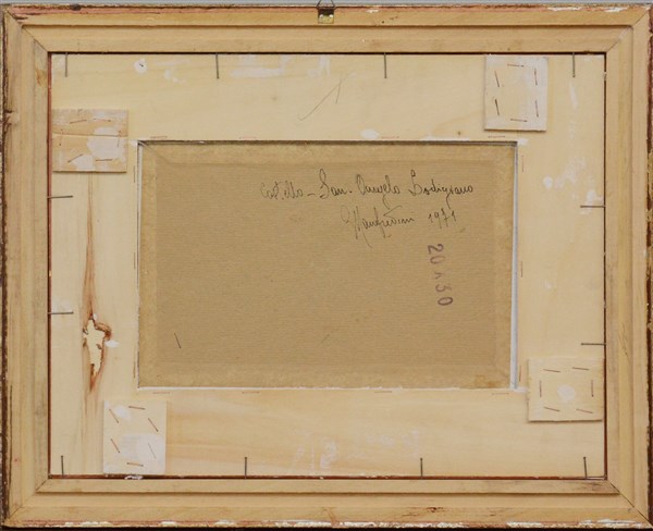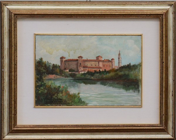 "Castello, San Angelo Lodigiano" 1971, olio su cartone telato (cm 20x30) firmato in basso a sinistra. Al retro: firmato, datato e titolato. In cornice
