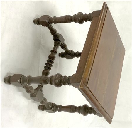 Tavolino in legno con gambe tornite riunite da traverse (cm 52x48x42) (difetti)