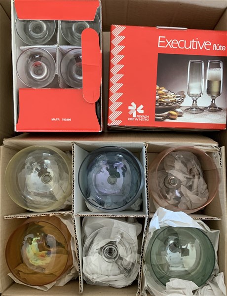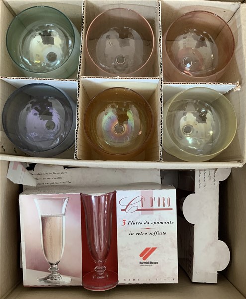 Lotto di due cartoni contenenti numerosi bicchieri di fatture differenti in confezioni originali (lievi difetti)