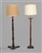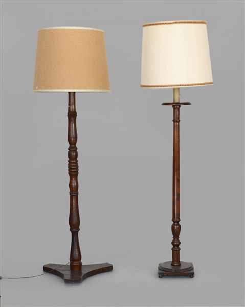 Lotto di due lampade da terra con fusto in legno tornito e paralumi in stoffa (
