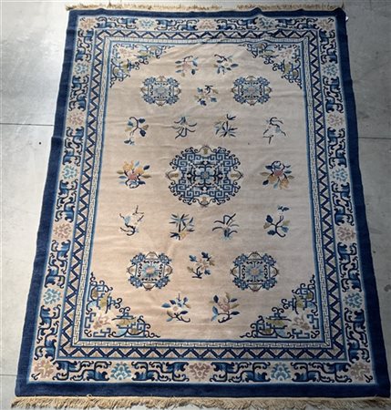 Tappeto Cina, Secolo XX. Decoro con piccoli medaglioni su fondo beige (difetti) (cm 276x191)