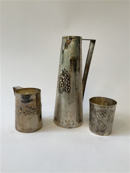 Lotto composto da uan caraffa e due bicchieri in argento decorati a frutta e mo