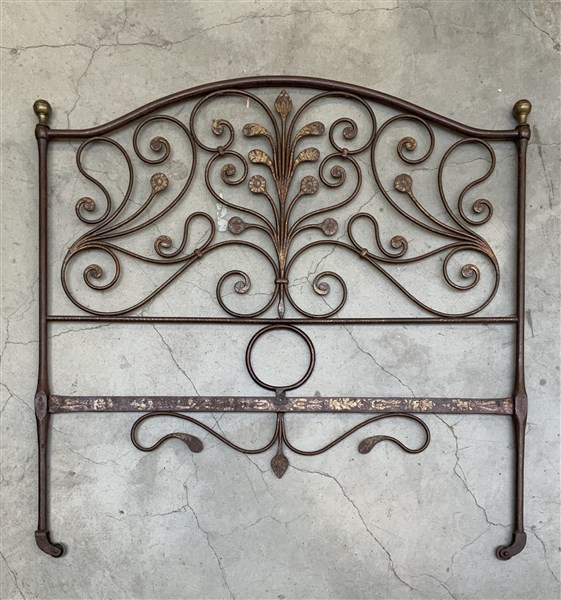 Testata da letto a una piazza in ferro battuto, parzialmente dipinto, con decoro a volute (cm 106x104) (difetti)