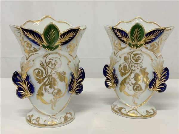 Manifattura del secolo XIX. Coppia di vasi di forma mossa in porcellana decorata con dorature a volute fogliate. Marcati "P8A55" nelle basi (h. cm 23) (difetti)