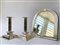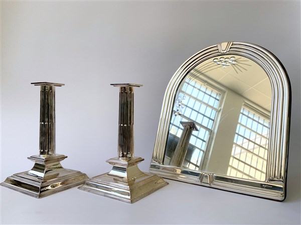 Coppia di portacandela in argento a guisa di colonna su base scantonata (h. cm 23), uniti ad uno specchio da tavolo con cornice in argento. Titolo 800, marcati "Cesa 1882" (g netti 900)