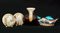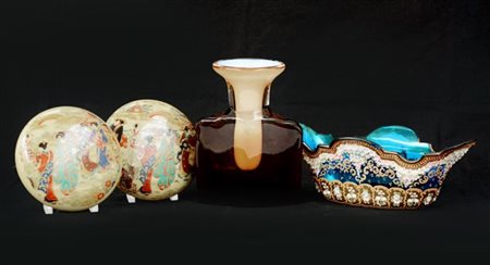 Lotto composto da un vaso in vetro incamiciato lattimo e pagliesco, un centrotavola in vetro con decori in oro e ceramica policroma uniti a due coperchi in ceramica giapponese.(lievi difetti)
