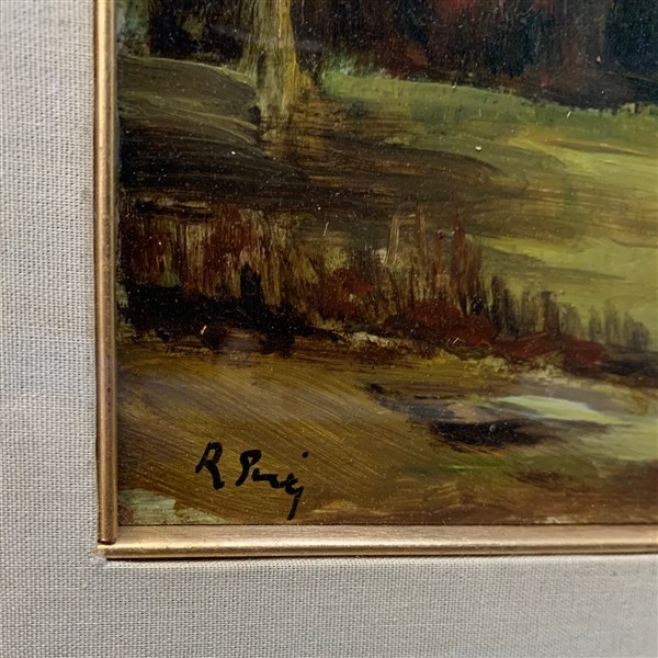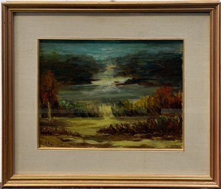 "Paesaggio fluviale" olio su masonite (cm 30x40) Firmato in basso a sinistra. Al retro: dedicato e datato 1.1.1989. in cornice