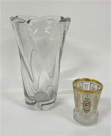 Lotto composto da un vaso in cristallo a bordo costolato e un bicchiere di manifattura boema, con decoro floreale in policromia e oro (h max cm 33) (difetti)