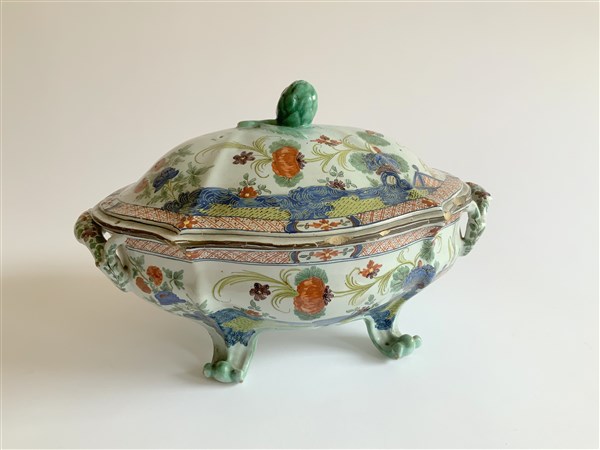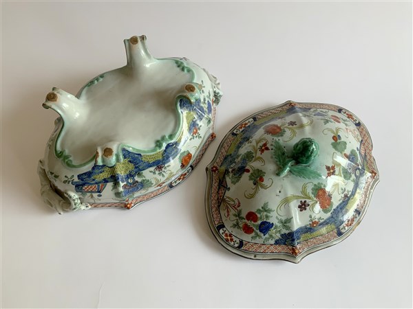 Zuppiera in maiolica di forma mossa dipinta in policromia a motivi floreali, presa del coperchio a forma di carciofo (l cm 34, h cm 22) (difetti)
