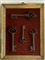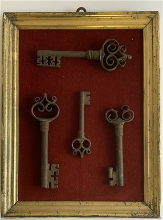 Cornice contenente quattro chiavi in ferro battuto, di epoche diverse (cm tot 2