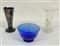 Manifatture diverse, lotto composto da due vasi di diversa forma e decoro in vetro lavorato uniti ad una coppa in vetro soffiato blu (difetti)