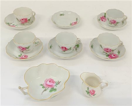 Manifattura di Meissen. Lotto composto da cinque tazzine con piattini, una lattiera e un vassoio in forma di foglia in porcellana bianca decorata a fiori rosa (difetti)