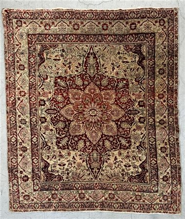 Tappeto Kirman Laver, Persia, fine secolo XIX. Decoro con grande medaglione nei toni del ciclamino, azzurro e blu su campo color bianco crema(cm 140x126) (difetti, piccole rotture e mancanze)