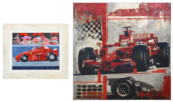 Lotto composto da due dipinti a tecnica mista, uno su tela e uno su tavola, raffiguranti Ferrari, di autori e misure diverse