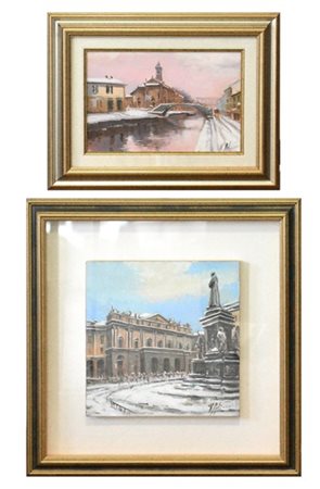 Firma indecifrata. Lotto di due dipinti ad olio raffiguranti "Scorci di Milano"