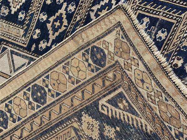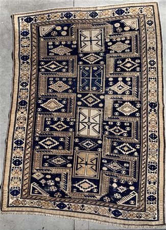 Tappeto Schirwan, Caucaso, fine secolo XIX. Decoro geometrico stilizzato nei toni del sabbia, beige, azzurro e blu su fondo blu. (Difetti e rapature)(cm 160x109)