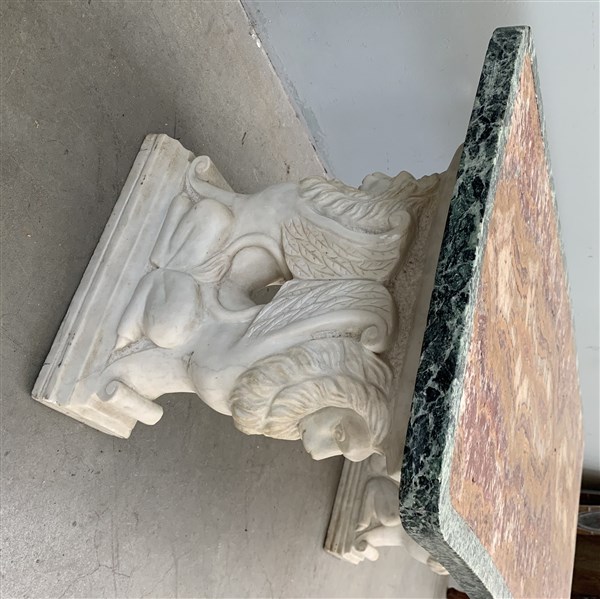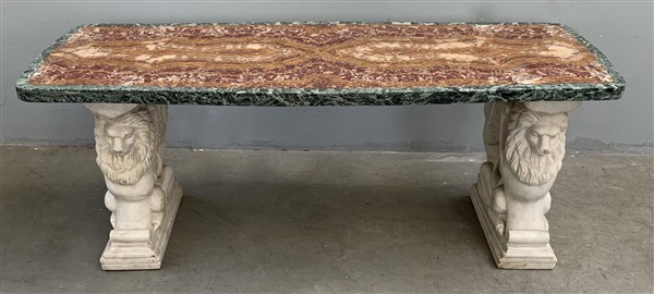 Tavolo da salotto con piano lastronato in marmi vari e sostegni a leoni in marmo bianco (cm 125x47x51) (difetti)