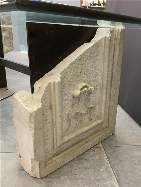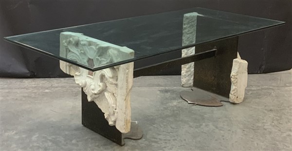 Tavolo da salotto con struttura in ferro brunito. Montanti parzialmente rivestiti da fregi in marmo del secolo XVIII. Piano in cristallo (cm 180x60x80) (difetti e rotture)
