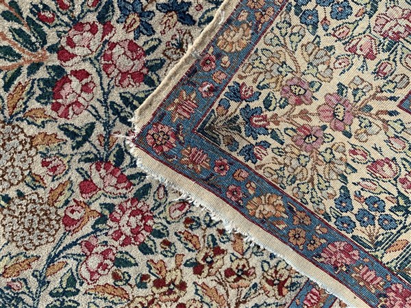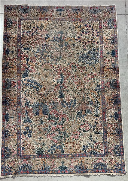 Tappeto Kirman, Persia, secolo XX. Decoro millefleurs con alberi della vita e rami fioriti su fondo crema (Lievi difetti) (cm 200x134)