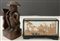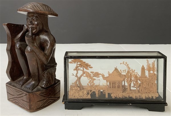 Lotto composto da una sculturina africana in legno e un oggetto orientale in teca contenente paesaggio con pagode (difetti)