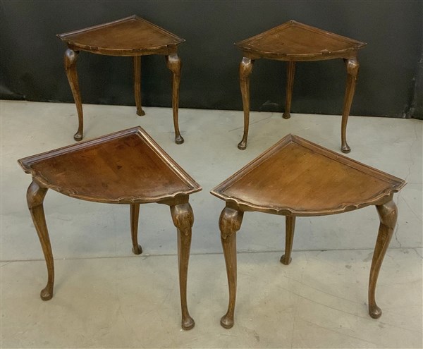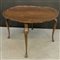 Fornitura da salotto composta da un tavolo con piano e gambe a sagoma con quattro tavolini d'appoggio analoghi di forma triangolare (d cm 90, h cm 56) (difetti)