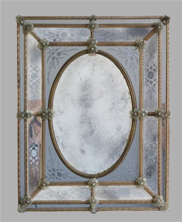 Manifattura di Murano. Specchiera con specchi esterni incisi a motivi floreali, profili in canne di vetro decorate da fiori applicati (cm 103x81) (difetti e mancanze)