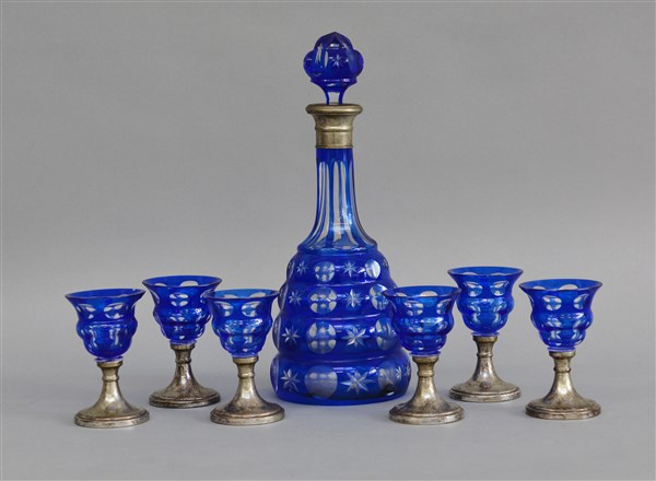 Manifattura di Boemia, servizio da rosolio in cristallo molato blu composta da bottiglia con tappo e sei bicchierini, con basi e ghiere in argento (h max cm 26) (difetti)