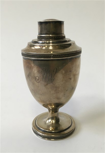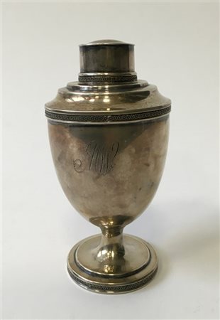 Portatè con tappo a corpo piriforme in argento liscio, fasce decorate a motivo corrente, vasca monogrammata. Punzoni non decifrati (h. cm 14) (g 150)