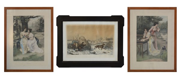 Lotto di tre litografie a colori raffiguranti scene galanti e scena di caccia,